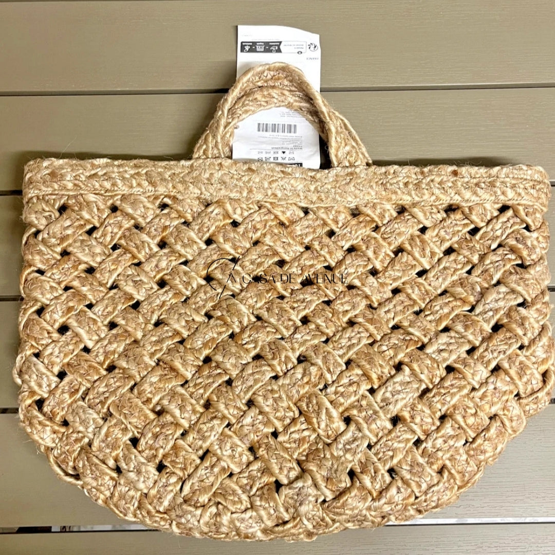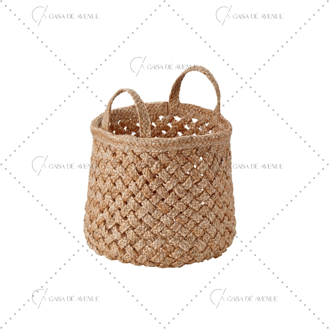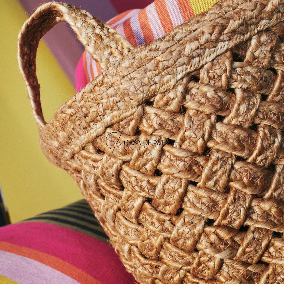 The decorative pattern is handwoven from braided jute fibres – a natural material with colour variations that give each basket a unique expression.